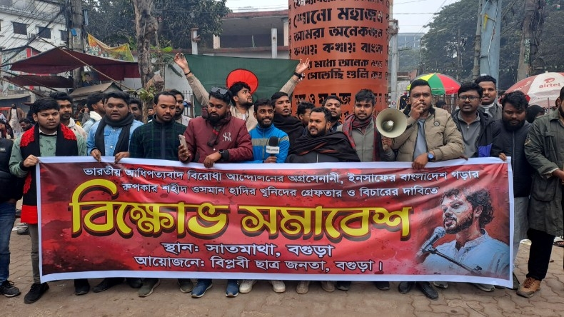 বগুড়ায় ভারতীয় আধিপত্যবাদ বিরোধী আন্দোলনকারী ও ইনকিলাব মঞ্চের মুখপাত্র শহীদ শরিফ ওসমান হাদীর খুনিদের বিচারের দাবিতে বগুড়ায় বিক্ষোভ সমাবেশ করেছে
